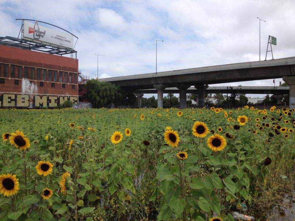 “I am using a private vacant block in order to create a visually stunning field of sunflowers. This former site of a spring factory will become a field of golden yellow, juxtaposed against warehouse buildings, factory walls, a train line and a freeway. If you were to fly over this site the landscape would appear to have yellow block of color sitting incongruously amongst a dull grey industrial landscape,” Morieson says.