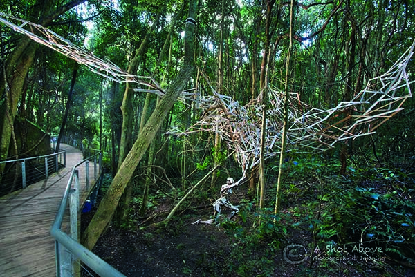 Following the presentation, Sykes-Smith said with the help of her mother and friends, the experience of installing over the five days in the rainforest was pure adventure. “I have never done a work of this scale or suspended. I knew it was an ambitious idea but I was aware that with the skilled installation team led by Richard Harrison, this sculpture would became a reality,” she said.