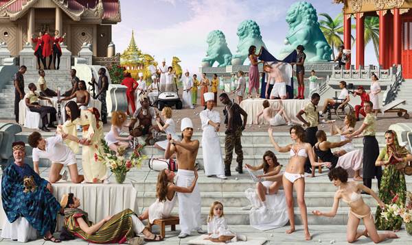 The inhabitants of this paradise are of diverse cultural backgrounds and can be distinguished by their clothing – the hotel guests are dressed in white robes and the servants wear traditional dress. As they move in slow, robot-like choreography, the formations of group dynamics against the generic landscape evokes historical references, such as to neoclassical and baroque styles of art and architecture.