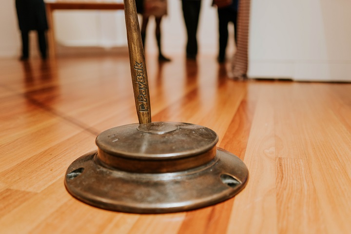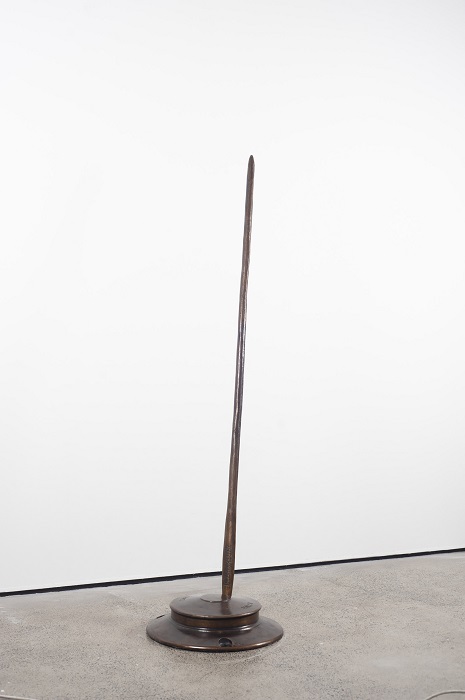 ‘Policeman’s hats’, also known as ‘silent cops’, were small hemispherical metal markers positioned at the centre of intersections to control traffic flow. Douglas combined this symbol of police presence with a traditional spear and refashioned the two objects together in bronze. It’s a powerful statement to heighten the public’s attention to the serious issues of indigenous deaths in custody, dispossession and loss. At the spear’s base, Douglas adapted the PayPal logo into ‘PayBak’.