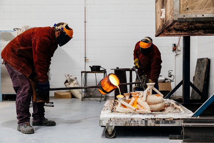 Phillip Piperides and workshop colleagues prepare bronze castings at Perides Fine Art Foundry, in preparation and production of artist Hiromi Tango’s collaborative artwork Roots, 2020. Commissioned by the Brisbane City Council for the Platform Project Courtesy Museum of Brisbane, Queensland