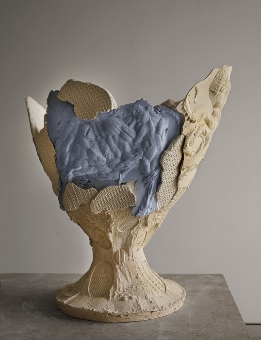 “The work left a strong impression on the judges, who found the piece exceedingly fascinating and resolutely well-made. The form makes exquisite use of cast relief elements that capture the imprint of various surfaces. The collaged parts fuse to create a vessel that feels effortless and suggestive of different eras and uses. It is evocative of archaic pottery and the materiality of 3D printing and could be interpreted as a vessel and a nest, ornamental and practical, sculpture and painting.”