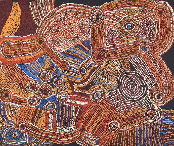 A 3-metre painting Untitled (Ceremony of Mount Allan) (1989/90) by the founder of the Western Desert art movement, Clifford Possum Tjapaltjarri, the work toured the United Kingdom immediately after his private audience with her Majesty Queen Elizabeth II and Prince Phillip at Buckingham Palace.