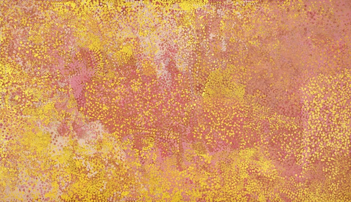 Cooee Art Senior Art Specialist, Adrian Newstead says of the work, ‘A number of exceptional paintings, including this particular work were produced between November 1991 and February 1992 when the Eastern Desert was overwhelmingly humid with hot northerly winds. The anticipation of rain and the ongoing ceremonial activity enlivened the spiritual atmosphere. In this painting, which can be viewed horizontally or vertically, radiant fields of yellow and pink dots which cluster and trace across the surface vary in hue and density.’