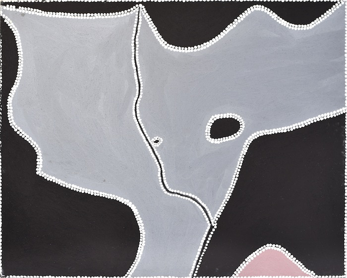 Addition auction highlights include an extremely rare bark work Wandijina (c.1976) by Wonambul elder Alec Minglemanganu; thought to be one of the artist’s earliest works. Minglemanganu’s barks are highly distinctive and unique in proportion, composition and tonal quality. The full-length figure of a Wandjina is decorated in lines of dots similar to body painting designs, intended to give a visual brightness which express the spiritual essence of these primary ancestral beings. The finely dashed, red infilling seen on the body represents falling rain. Only five barks by this revered artist have ever appeared for public sale.