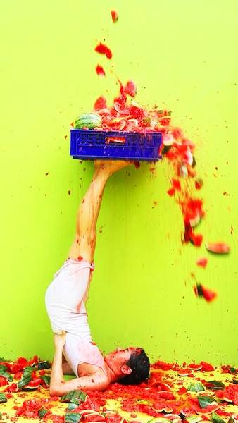 Senior Curator, Anna Briers who created the exhibition was interested in responding to site and context together with the unique social and cultural histories that relate to place. She explains that ‘Cornucopia’ was conceived to respond to the Greater City of Shepparton which is known as the ‘food bowl of Australia’. The exhibition takes place across the entire upper level of SAM encompassing six exhibition spaces. Mediums include painting, photography, print, video, installation and sculptural works. One hundred ceramic vases from the SAM collection will feature in the show with some taking the form of cornucopias. Kawita Vatanajyankur’s The Scale [still] (2015) sees a fluoro mix of refreshing colours collide with the artist who is in a precarious position as she attempts to sustain the overpowering weight of the fruit bearing down on her body.