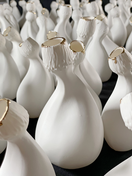 Botanically Porcelain is a floor-based field of more than 1,000 hand-built porcelain sculptures that speaks to the simultaneous and conflicting qualities of nature – fragility and endurance. The installation offers a similar feel to a wildflower meadow scene; however, upon closer view, one can admire each object’s distinction owed to Beasley’s careful crafting with gold lustre. Each detail adds to the work’s narrative of growth and survival.