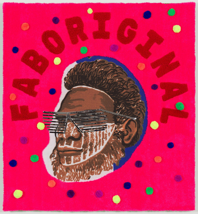 Kait James, Faboriginal, 2024, acrylic yarn, cotton, digital printed cotton, mirror tiles, felt, 150 × 140 × 10cm. Photograph: Christian Capurro. Courtesy the artist, Neon Parc, Melbourne and Ararat Gallery TAMA, Victoria
