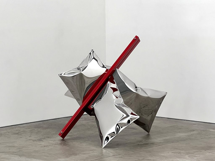 Braddon Snape, The wrestle, 2024, welded, mirror polished and air inflated stainless steel; welded and powder coated steel; stainless steel hardware, dimensions variable. Courtesy the artist and Straitjacket, New South Wales