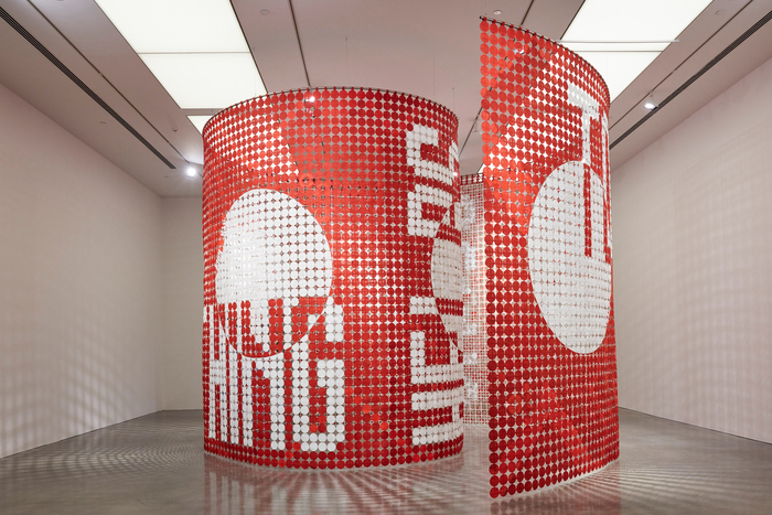 Rose Nolan, To Keep Going Breathing Helps (circle work), 2016–7, installation view, Museum of Contemporary Art Australia, Sydney, acrylic paint, hessian, embroidery thread, steel, Velcro, 420 × 600cm (overall). Courtesy the artist, Anna Schwartz Gallery, Melbourne, Museum of Contemporary Art Australia, Sydney and TarraWarra Museum of Art, Melbourne