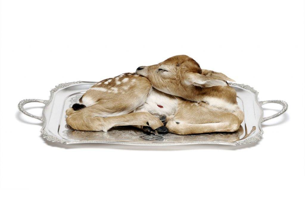 2) Julia deVille, Sorrow, 2012, stillborn deer, glass, antique platter, rubies 0.35ct, enamel paint, 56 x 35 x15cm