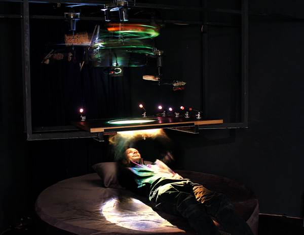 Finitude is a new media work created by Keith Armstrong, in collaboration with Roger Dean, Darren Pack and Stuart Lawson. Consisting of touch sensitive interactivity, 3D moving imagery, moving sculptural objects, lighting and multi-channel sound, this exhibition is complex and experiential: participants recline underneath the work and interact, while other audience members watch the unfolding, computer-generated landscape imagery.