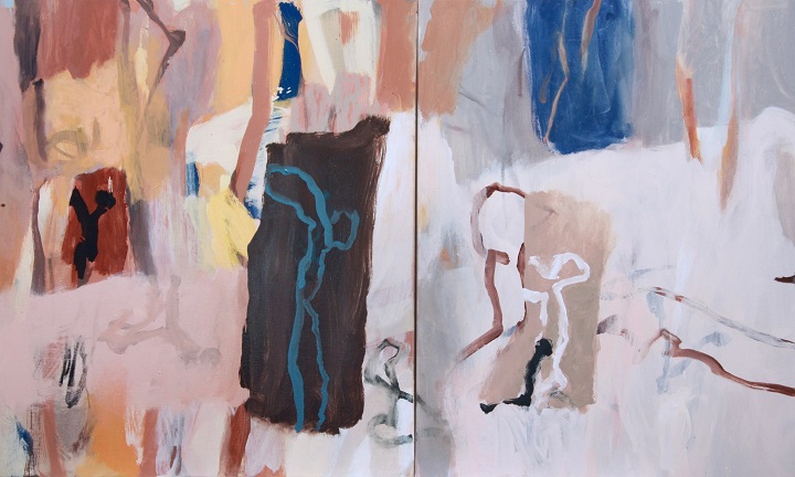 David Collins, Hot Burn, 2021, oil on canvas, 122 × 200cm (diptych). Courtesy the artist and Grace Cossington Smith Gallery, Sydney