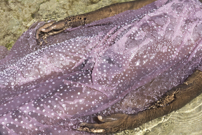 Scenes of the natural environment in Australia and Vanuatu are beguilingly interrupted with otherworldly, but recognisable forms, such as feet, nipples and a woman’s torso in the performative and photographic work of the collaborative duo. Often in ‘Touching Pool’, writes Kathleen Linn ‘screens or coverings abstract the body as a sculptural form, foregrounding the shape and acting to dissipate the sexualised projections frequently made onto naked female bodies.’