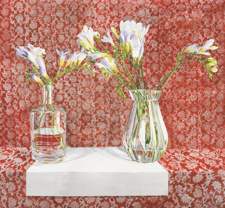 Remarkable for their vivacious colour against patterned black and white – suggesting wallpaper, because the imagery is immediately domestic – glass vases of flowers: giant vases of giant flowers, the water distortion rendered in a manner as accomplished as any fifteenth century still life. In one, the background pattern includes fighter jets and refugees – “the Ukraine war started as I began to paint them.”
