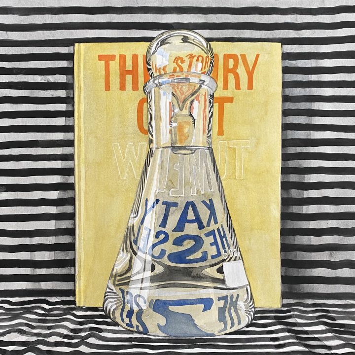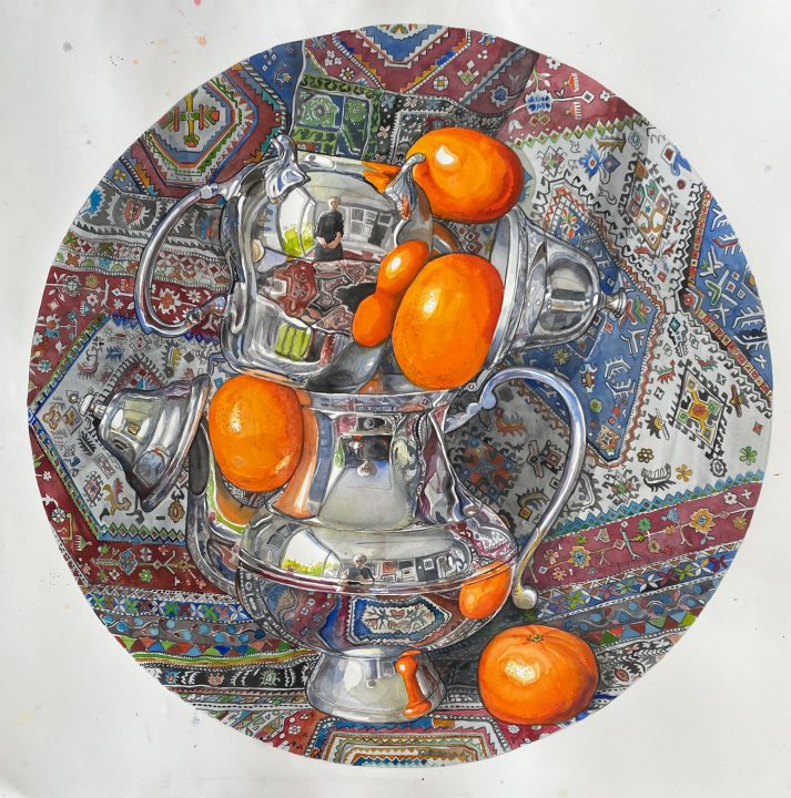 The images are bold, delicately executed. Highly polished pieces of household silver: jug, teapot, coffee pot, but balanced on each other, tiny images reflecting the artist and surrounds. Think van Eyck’s Arnolfini. Artists look to art, not fashion. When Ackland trained, watercolour was derided, realism was passé. Sophisticated, blazing with colour, ironic, remembering history and noting the present, reflecting lived experience with grace, these pictures laugh at those ideas.