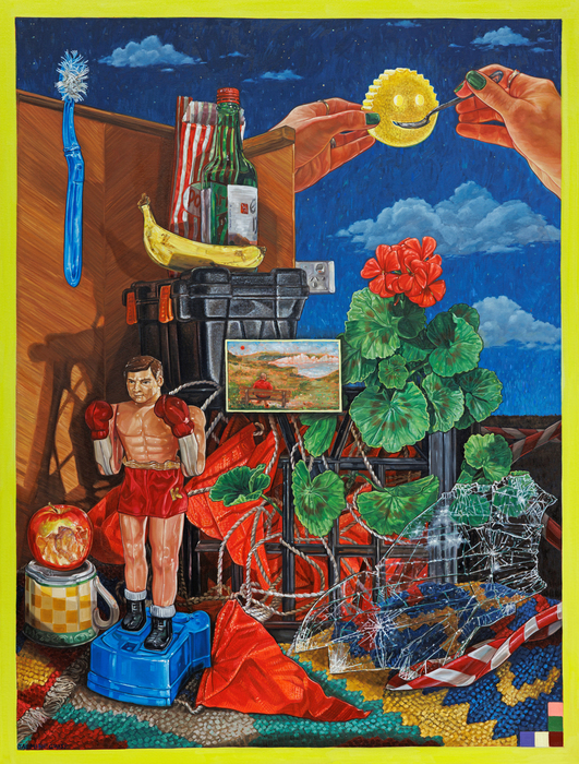 Through colourful, hyper-detailed, and intricate paintings, conventions of still life and portraiture are enlivened with intriguing narrative elements; the artist’s often maximalist scenes inserting long-established symbols into domestic or nostalgic versions of the present – forming reimagined landscapes of felt human experience, depicting people who have found themselves caught between competing, often contradictory forces.