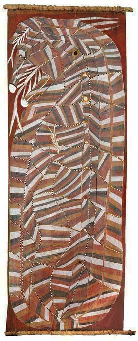 John Mawurndjul, Ngalyod (Female Rainbow Serpent) (detail), 1988, earth pigments on Stringybark (Eucalyptus tetrodonta). Museum of Contemporary Art Australia, purchased with funds donated by Mr and Mrs Jim Bain, 1989. Photograph: Jessica Maurer. © John Mawurndjul / Copyright Agency, 2020. Courtesy the artist, Museum of Contemporary Art Australia, Sydney and Charles Darwin University Art Gallery, Northern Territory
