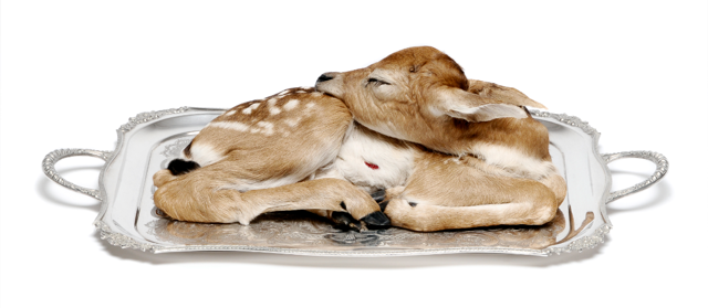 Image: Julia deVille, Sorrow, 2012, stillborn deer, glass, antique platter, rubies 0.35ct, enamel paint, 56 x 35 x15cm