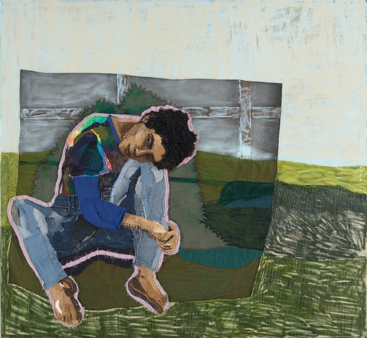 Winner Archibald Prize 2023, Julia Gutman, Head in the sky, feet on the ground, oil, found textiles and embroidery on canvas, 198 × 213.6cm. © the artist. Photograph: © Art Gallery of New South Wales, Jenni Carter