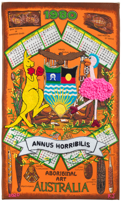 Kait James, Annus horribilis, 2020, vintage tea towel, cotton. © the artist. Courtesy the artist and Art Gallery of Ballarat, Victoria