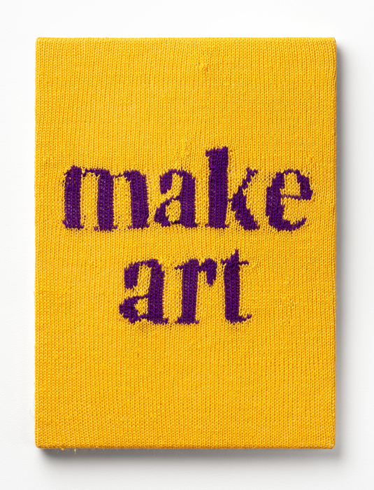 Kate Just, SELF CARE ACTION: (Make Art), 2023, hand-knitted acrylic yarn, canvas, and timber, 55 × 40cm. Photograph: Simon Strong. Courtesy the artist and Linden New Art, Melbourne