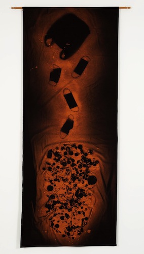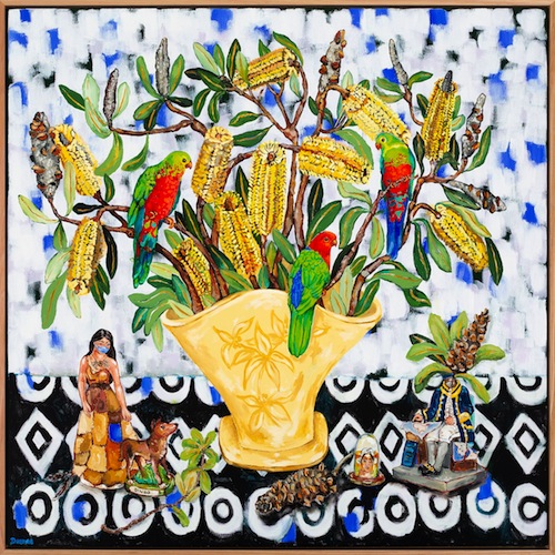 Deanne Gilson (Wadawurrung), Post Pandemic, After the Gaze, the King Parrots Bring Hope, white ancestral ochre, acrylic, wattle tree sap, fabric, elastic, wood on stretched linen