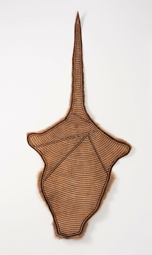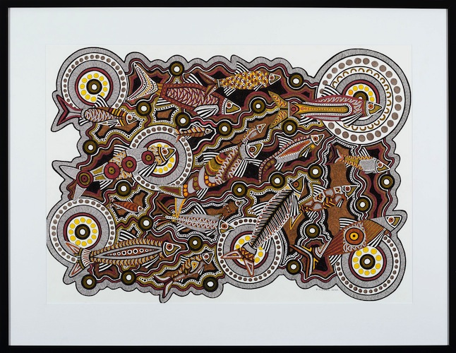 Patricia Pittman (Yuin Nation – Bega NSW), River Dreaming, acrylic and ink on paper, and Iluka Sax-Williams (Taungurung, Tibrean), Untitled work, pokerwork on kangaroo skin