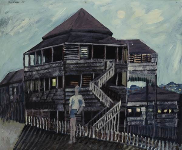 Blackman’s drawings retain a vitality and immediacy that focus on the human presence in relation to the external environment, externalising all that is internal. Paradoxically he deals with anguish through opportunity, a reflection of the autobiographical nature of his practice. Blackman’s subjects were the people he knew. Their presence is apparent in works such as The family (1955) depicting a picnic near Cedar Falls at Mt Tamborine with Judith Wright, Jack McKinney and their daughter, Meredith. Blackman also painted the ‘Alice’ series for his wife, giving “sight to her poetry”. The blue shroud on her eyes is symbolic to her poor eyesight and synonymous with Nolan’s Ned Kelly mask.