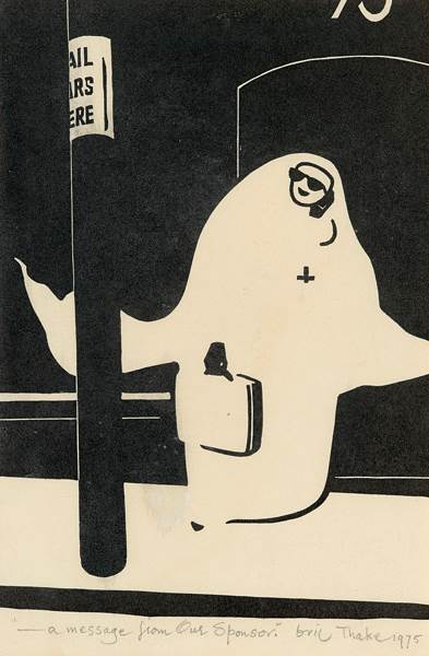 Eric Thake, A Message From Our Sponsor, 1975, linocut, 21 x 14cm