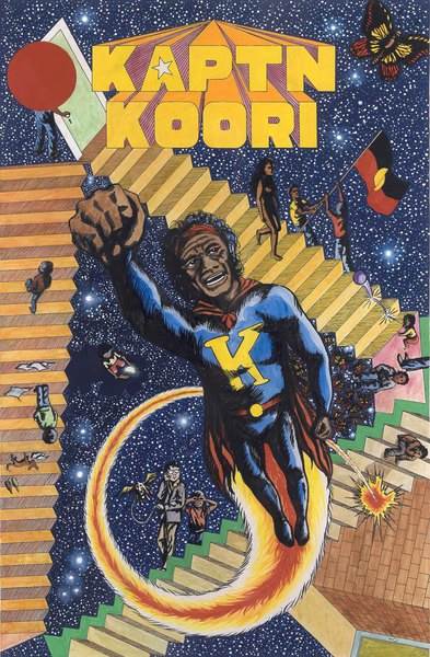 Lin Onus, Kaptn Koori, reproduced from Urban Dingo, the art and life of Lin Onus. Courtesy Bunjilaka Aboriginal Culture Centre, Melbourne