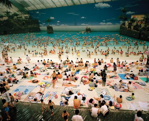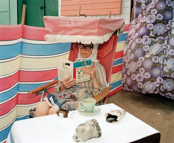 The Ocean Dome (1996) photographed in Japan, emulates a real beach when in fact the beach depicted has been physically constructed. The tightly packed crowd lines the sand. People continue out into the water until they are abruptly halted by a wall, positioned where the line of the horizon should be. The crowd seems unfazed by the artificiality presented to them as they continue to enjoy their time in the dome. When Parr takes his lens from a distant shot and narrows in on areas within close proximity, a more personal side to the people residing on the shore is discovered. Kent. Margate taken in England in 1986, shows a lady well equipped to combat the sun. She has made her reading experience as comfortable as possible with her cup of tea just within reach. This is her way of spending time by the seaside.