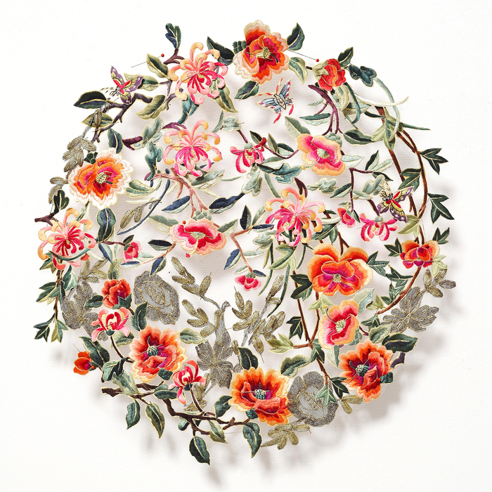 Louise Saxton, Wall Garden, 2016–2017, reclaimed needlework, lace-pins, nylon tulle, acrylic baton, 300 × 192cm. Town Hall Gallery Collection. Photograph: Gavin Hansford. Courtesy the artist, Gould Creative, Melbourne and Town Hall Gallery, Melbourne