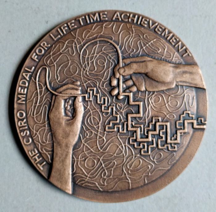 Michael Meszaros, CSIRO Award medal, 1985, bronze, 15cm diameter This medal is one version of the CSIRO Award medal. It is awarded with ten different inscriptions for different categories using the same design. Courtesy the artist and Town Hall Gallery, Melbourne