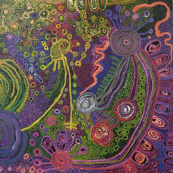 Rhoda Tjitayi, Piltati, 2024, acrylic on linen, 180 × 180cm. Courtesy the artist and APY Art Centre Collective