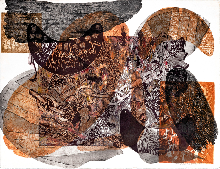 Indigenous printmaker Paul Bong from Far North Queensland is showcasing a series of 25 intaglio etching prints in ‘Error of Parallax’. This new body of work reveals ‘two lines of sight’ and highlights the resultant divergence of cultural perspectives amidst frontier conflicts, particularly in his homeland. Bong’s stories come to the surface in layers of collaged imagery that move through passages of time – early colonial regalia and weaponry and fragmented shields and artefacts tell stories of conflict that, for the artist, are forever present.
