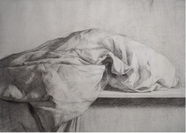 Wolseley described Material landscape as a powerful and beautiful drawing with skillful and evocative use of the charcoal medium: ‘This drawing of creased and folded cloth resting on a table evoking a mountain landscape reminds me of some of the theories of the geographer Jay Appleton in his book The Experience of Landscape. Appleton suggests that ‘prospect, refuge and hazard’ are the three main responses which those walking over the land often experience. We are pulled up to the tops of hill where we can scan the valley below for potential enemies, or we are attracted to caves or enclosed spaces where we can seek refuge, or we can be attracted to rocky or wild bits of country in some kind of romantic sublime urge towards danger. I see all these qualities in this poetic and expressive drawing.’