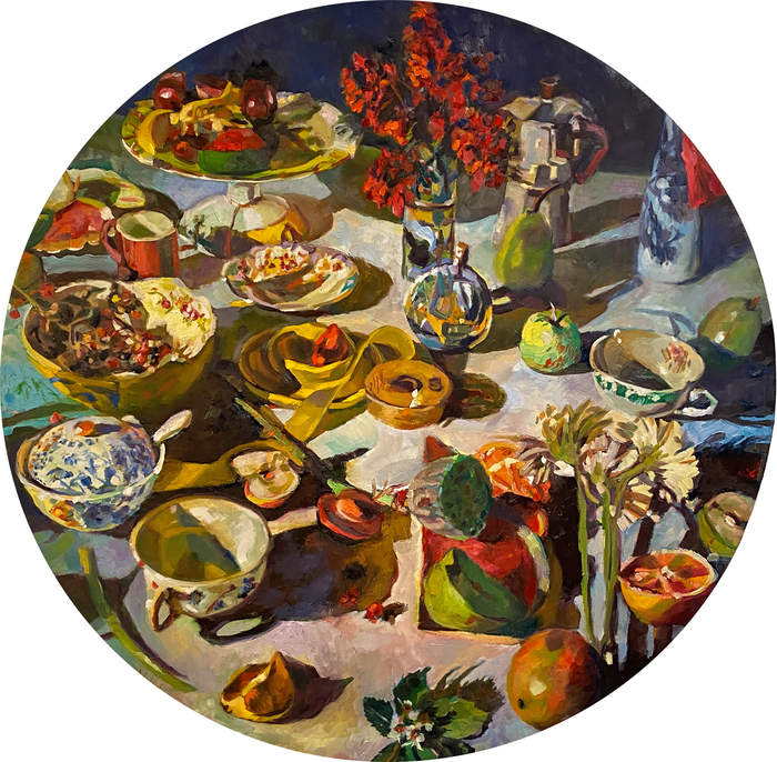 In Rosemary Valadon’s own words, this new body of still lifes displays “a joy of life, an enthusiasm, a restarting of optimism and expansion, a flow meandering between objects and shadows, the spaces in between. Designed to please the senses – almost touchable, smellable, delectable, light blues and turquoise – the sky, the sea, movement. Orange and reds in contrast. Warmth and juiciness.” A key piece is a tondo representing a complex arrangement of objects from the artist’s studio and home, as well as themes such as nurturance and pleasure.