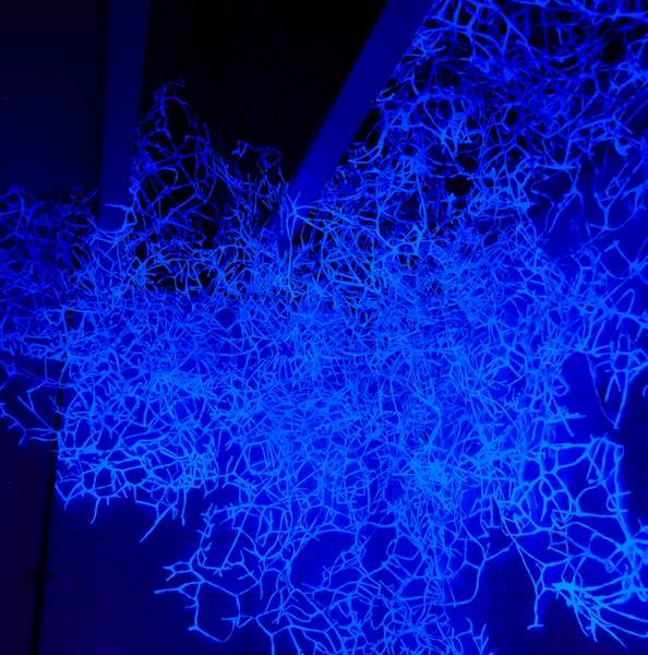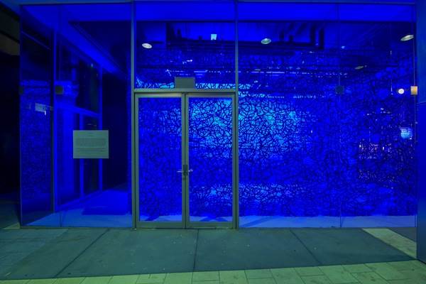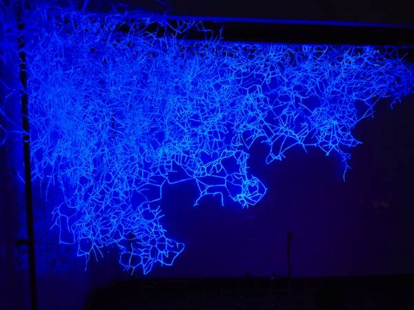 With ‘Locus’, there’s more than a slight feeling of being inside something virtual, perhaps because of the intricacy of the linework, which feels computer-generated. It’s not: Adair works with the processes of chance, deconstruction, elimination and reconstruction, hand-cutting her abstracted drawings into felt to make organic three-dimensional marks that push and pull their surroundings. The slightly radioactive tonality to the room adds to the sense that the marks are growing, intertwining and spreading across the vacant surfaces. They feel a bit out of control: on a macro scale, the room could be filling with encroaching plant matter. Flip your perspective and you could be inside a human body, staring at endometriosis, cancer, or moving through the waves of an ultrasound. Or perhaps it’s less earthly and more wonder-full: you could be immersed in cloud crystals or somewhere completely alien. There is no guidance; just immersion, sensation, reaction.