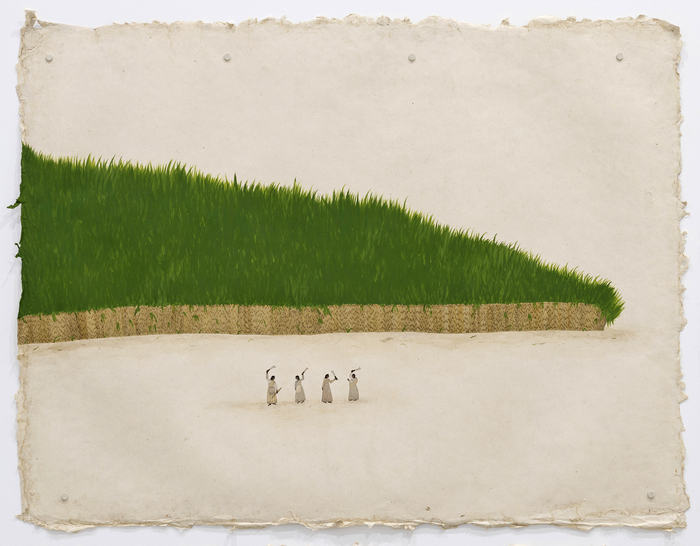 Sancintya Mohini Simpson, The Plantation (detail), 2022, watercolour and gouache on handmade wasli paper, 6 panels, approx. 95 × 125cm irreg., each 190 × 375cm overall. Photograph: Carl Warner. Courtesy the artist, Milani Gallery, Brisbane and Perth Institute of Contemporary Arts, Western Australia