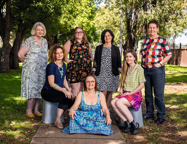 Artist Linda Brescia (third from right) and writer Felicity Castagna (second from left) with project participants from Kingswood, NSW, 2020. Photograph: Anna Kučera. Courtesy Museum of Contemporary Art Australia, Sydney