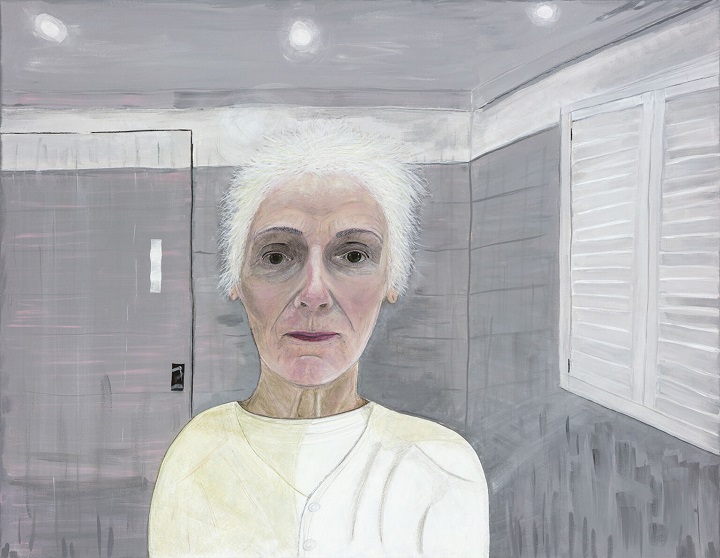 “. . . Paton appears within the composition as a ghostly apparition, with the face rendered drained of emotion, and her body pulled forward by the intensity of the eyes – holding the viewer in engagement. The psychological intensity of the subject is underwritten by the spare brushwork, the bleak colour and the searing splashes of the lights in the background. One cannot help but empathise with the feeling conveyed by the work. The starkness of the clinical colours chosen contribute to this sense of emotional and psychological lethargy. Despite this, there is a feeling of humanity to the piece; you get the sense of a real person – and bare witness to their pain.”
