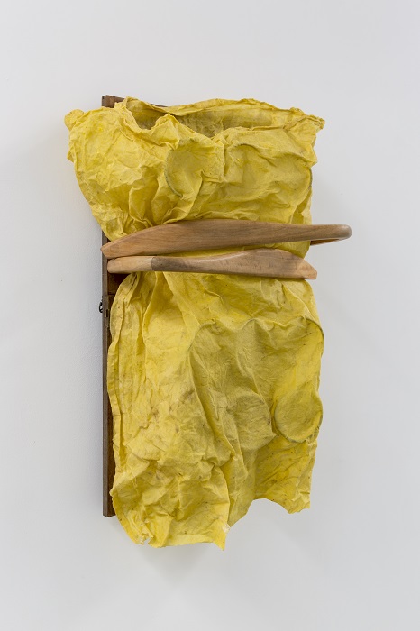 Fiona J Schoer, Finding Comfort in the Body, timber door, metal springs, calico, timber chair arms, wax, oil paint, metal fixings, 97 x 54 x 35cm