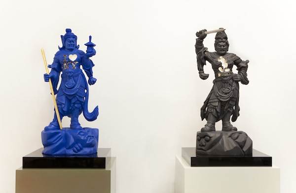 Looking elsewhere, but not straying too far from the artist’s eclectic mayhem of Edo Period art redux, the exhibition also features his most recent sculptural works. Bon Voyage (NY & LA) (2017) is a diptych with 22 karat gold leaf American iconography stenciled onto the amour of two warrior deities ready for assault. Like many of Matsuyama’s works that “remix elements from the multicultural world”, these statues draw inspiration from tourist paraphernalia and East Asian Buddhism.