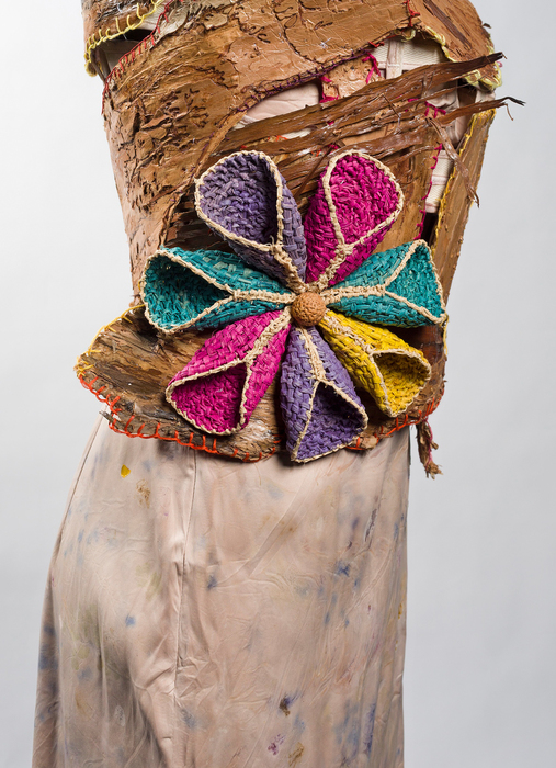Kylie Coleman (Darug, Wiradjuri), Paper Bark Corset (detail), 2025, paperbark, raffia, bees wax, native honey, lacquer (eco-friendly); Natural Dyed Dress (detail), 2025, synthetic (satin, eco-dyed)