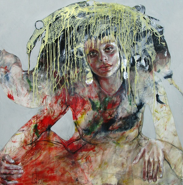 Esther Erlich’s new portrait series, ‘An Intimate Distance’ comprises paintings and drawings depicting half-figures – indeterminate hyper-gendered superheroes that provocatively fade in and out of abstraction, playfully investigating king princess iconography, fashion nova loyalty and escapism through fantasy.
