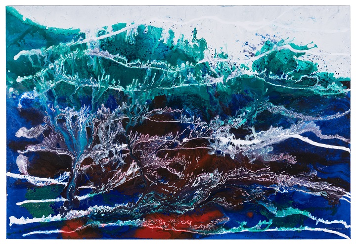 Eleven paintings express the development of Samantha Hobson’s new works alongside the artist’s existing and well-known bushfire and reef imagery. Her latest series, ‘Flag Waves / Wave Busts’ are “fractured”, coastal seascapes almost bursting with the visual clamour of a land rights street march! Some works feature the distinctive red, yellow and black colours of the Aboriginal flag; in others, red, blue and shards of white are powerfully strewn across the canvas – a comment on a culture clash within Australia’s colonial history?